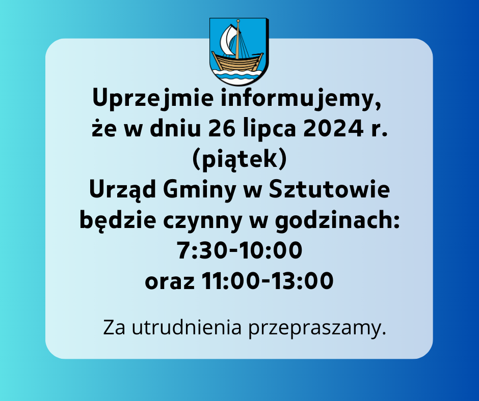 Strona główna » Aktualności » Godziny otwarcia UG dnia 26.07.2024 Data dodania 25.07.2024 Godziny otwarcia UG dnia 26.07.2024 Uprzejmie informujemy, że w dniu 26 lipca 2024 r. (piątek) Urząd Gminy w Sztutowie będzie czynny w godzinach: 7:30-10:00 oraz 11:00-13:00. Za utrudnienia przepraszamy. Drukuj