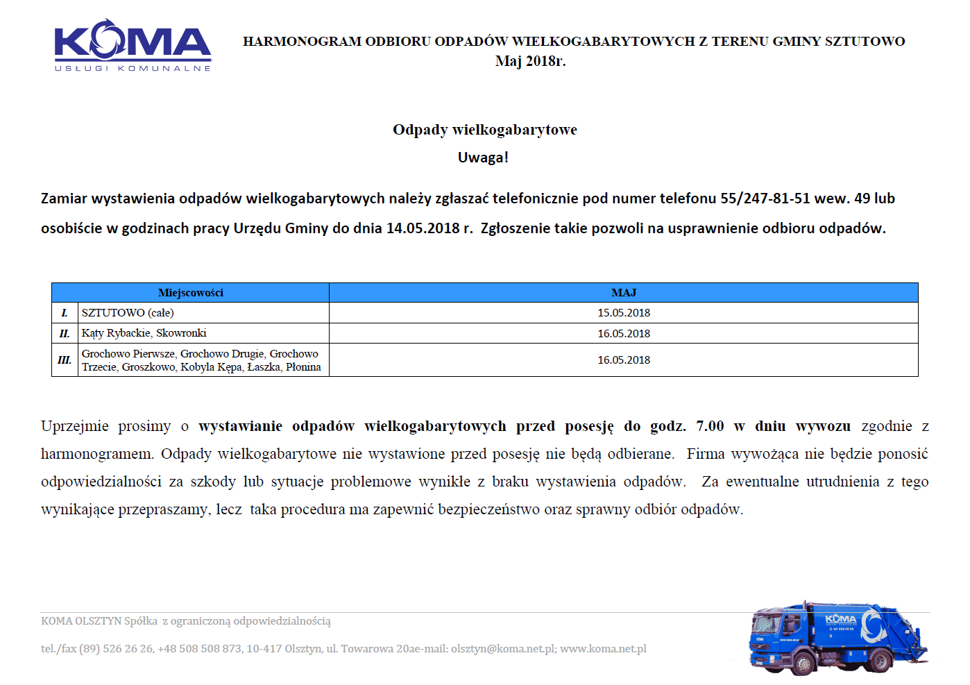 Strona główna » Aktualności » HARMONOGRAM ODBIORU ODPADÓW WIELKOGABARYTOWYCH Z TERENU GMINY SZTUTOWO – MAJ 2018 R. Data dodania 19.04.2018 HARMONOGRAM ODBIORU ODPADÓW WIELKOGABARYTOWYCH Z TERENU GMINY SZTUTOWO – MAJ 2018 R. Drukuj
