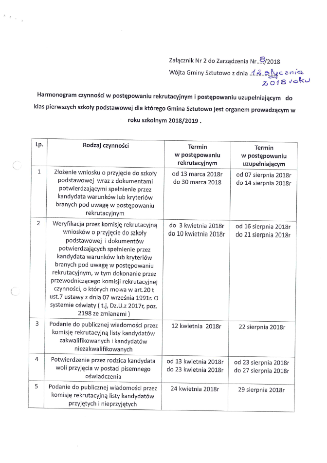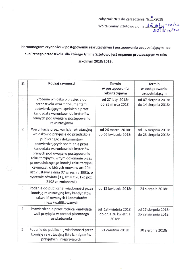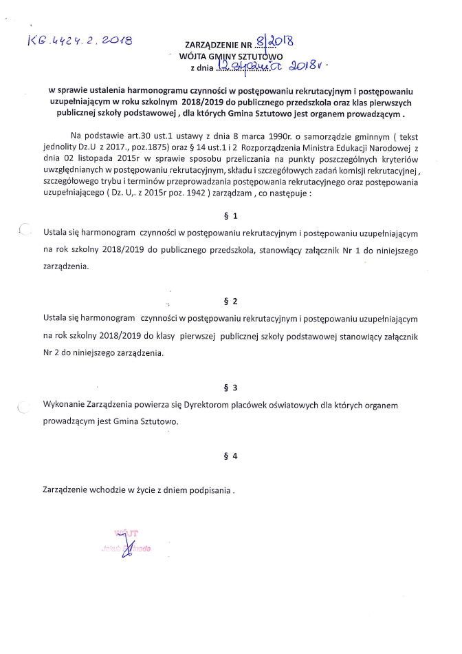 Ustalono harmonogram czynności w postępowaniu rekrutacyjnym i postępowaniu uzupełniającym na rok szkolny 2018/2019 do publicznego przedszkola oraz do klas pierwszych publicznej szkoły podstawowej, dla których Gmina Sztutowo jest organem prowadzącym. W rozwinięciu Zarządzenie Wójta Gminy Sztutowo wraz z harmonogramem.