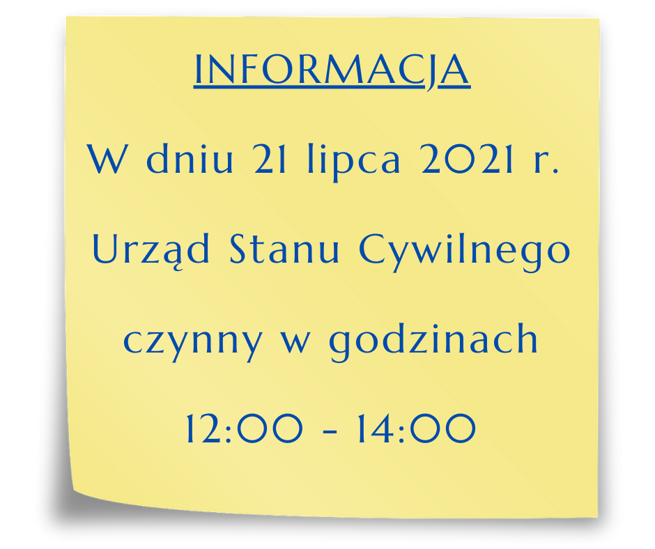 Strona główna » Aktualności » INFORMACJA Data dodania 20.07.2021 INFORMACJA Uprzejmie informujemy, że w dniu 21 lipca br. Urząd Stanu Cywilnego czynny będzie w godzinach 12:00 – 14:00. Za utrudnienia przepraszamy! Drukuj