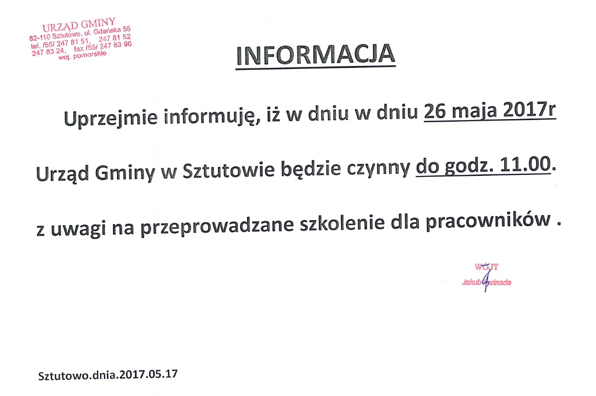 Strona główna » Aktualności » Informacja o godzinach pracy Urzędu Gminy Data dodania 17.05.2017 Informacja o godzinach pracy Urzędu Gminy Drukuj