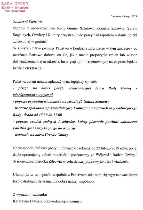 Strona główna » Aktualności » Informacja przewodniczącej Komisji Zdrowia, Spraw Socjalnych, Oświaty i Kultury Data dodania 05.02.2019 Informacja przewodniczącej Komisji Zdrowia, Spraw Socjalnych, Oświaty i Kultury Drukuj