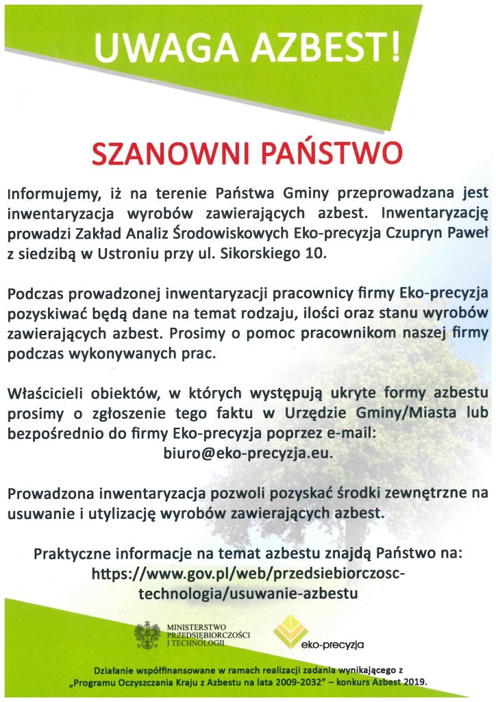 Strona główna » Aktualności » Inwentaryzacja azbestu na terenie naszej gminy Data dodania 30.08.2019 Inwentaryzacja azbestu na terenie naszej gminy Drukuj