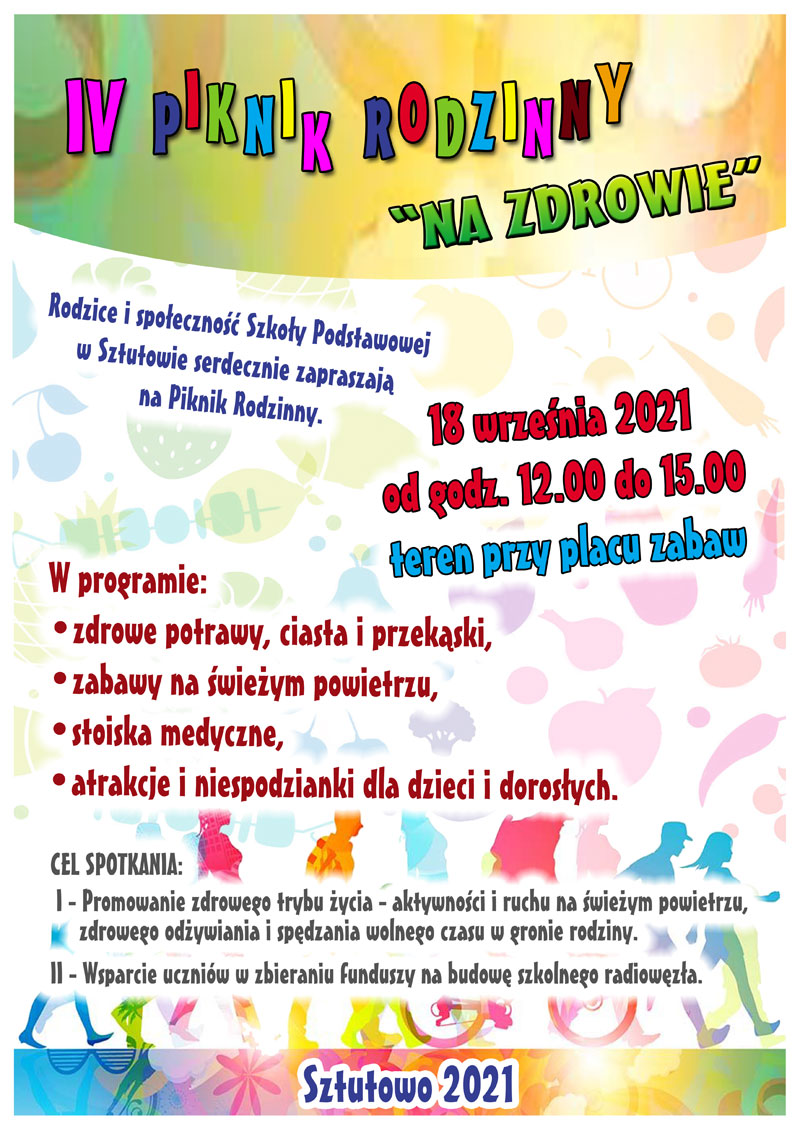 Szkoła Podstawowa w Sztutowie zaprasza na IV Piknik Rodzinny „Na zdrowie”, który odbędzie się 18 września od godziny 12.00 do 15.00, na terenie zielonym przy szkole, obok placu zabaw.