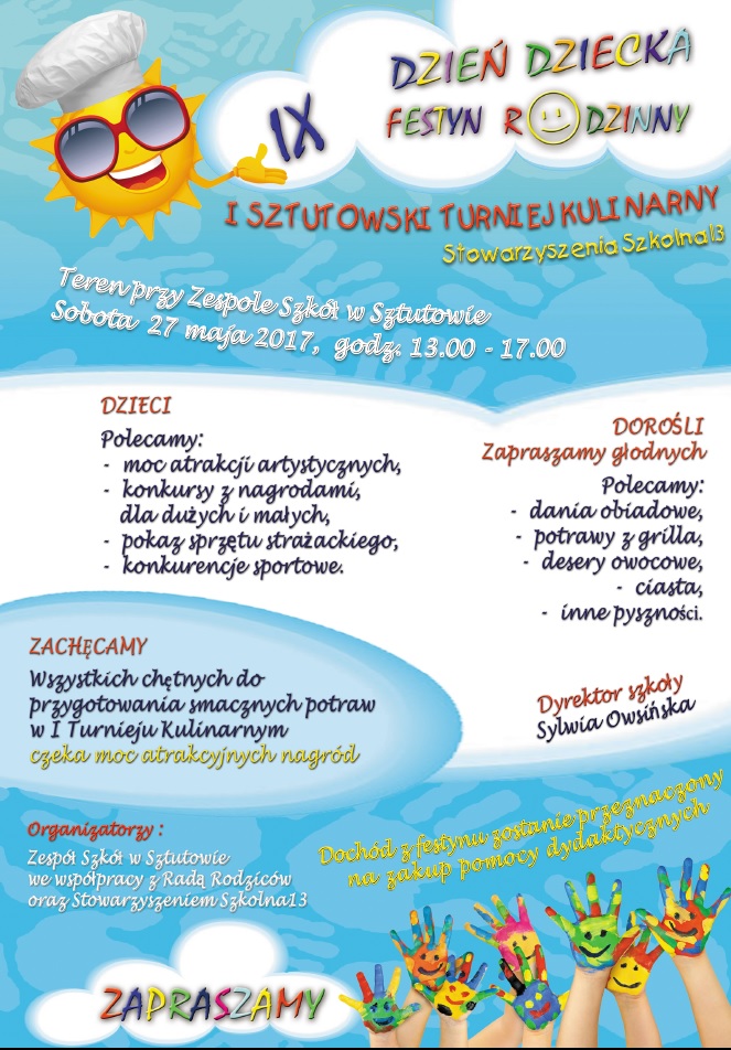 W sobotę 27 maja w Sztutowie od godziny 13.00 odbędzie się IX już Festyn Rodzinny i Dzień Dziecka. Zapraszamy chętnych – przygotowujemy moc atrakcji dla dzieci i dorosłych.