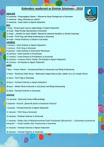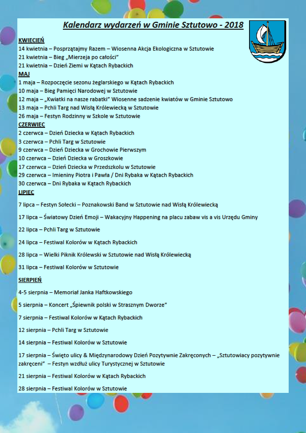 Zachęcamy do zapoznania się z kalendarzem wydarzeń, które odbędą się w Gminie Sztutowo w 2018 roku. O wszystkich wydarzeniach będziemy informować Państwa na bieżąco. Jeżeli jakiejś imprezy nie ma w naszym kalendarzu, a chcieliby Państwo o niej opowiedzieć lub zachęcić do udziału w niej – prosimy o kontakt z pracownikiem do spraw promocji w Urzędzie Gminy Sztutowo: Karoliną Owsińską pod numerem telefonu 55 247-81-51 wew. 26 lub mailowo: kowsinska@sztutowo.ug.gov.pl