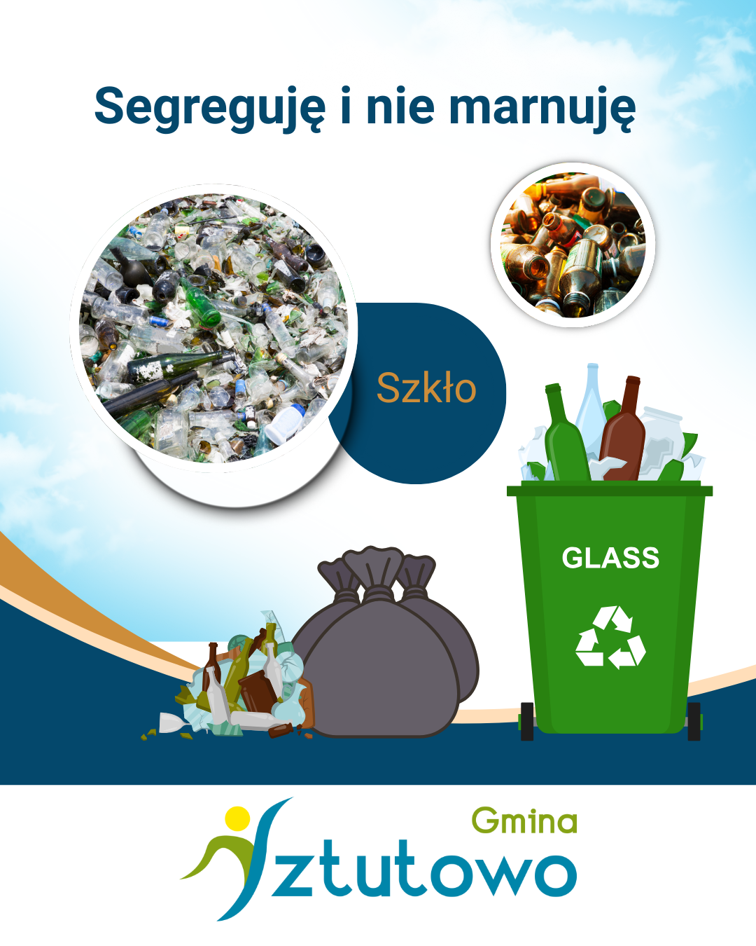Selektywna zbiórka – szkło opakowaniowe (butelki, słoiki) trafia do zielonych pojemników lub worków .