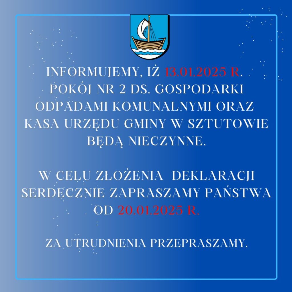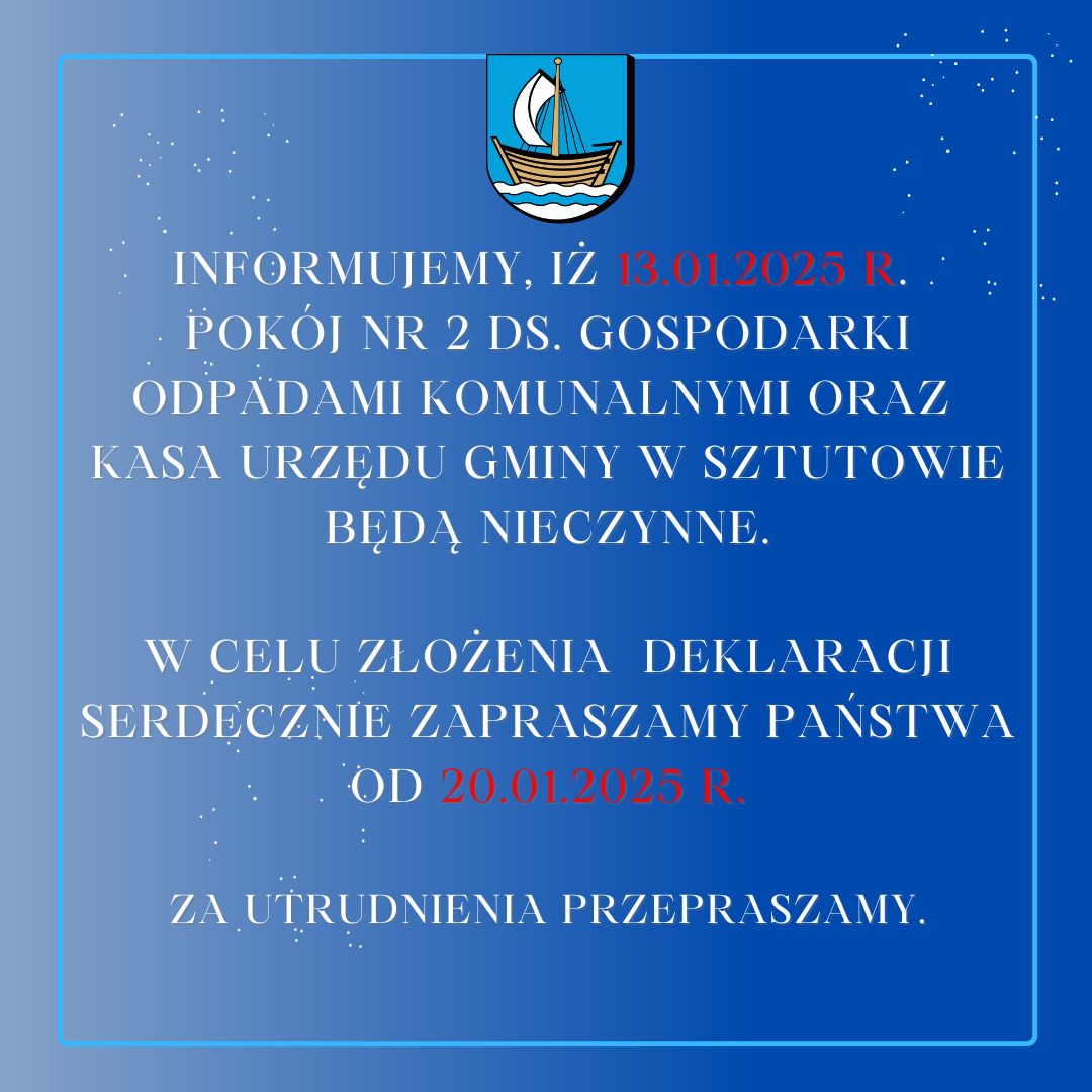 Strona główna » Aktualności » Komunikat Data dodania 13.01.2025 Komunikat Informujemy, iż 13.01.2025 r. pokój nr 2 ds. gospodarki odpadami komunalnymi oraz kasa Urzędu Gminy w Sztutowie będą nieczynne. W celu złożenia deklaracji serdecznie zapraszamy Państwa od 20.01.2025 r. Za utrudnienia przepraszamy. Drukuj