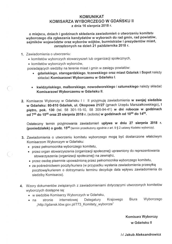 - O miejscu, dniach i godzinach składania zawiadomień o utworzeniu komitetu wyborczego dla zgłaszania kandydatów w wyborach do rad gmin, powiatów, sejmików województw oraz wyborów wójtów, burmistrzów i prezydentów miast.