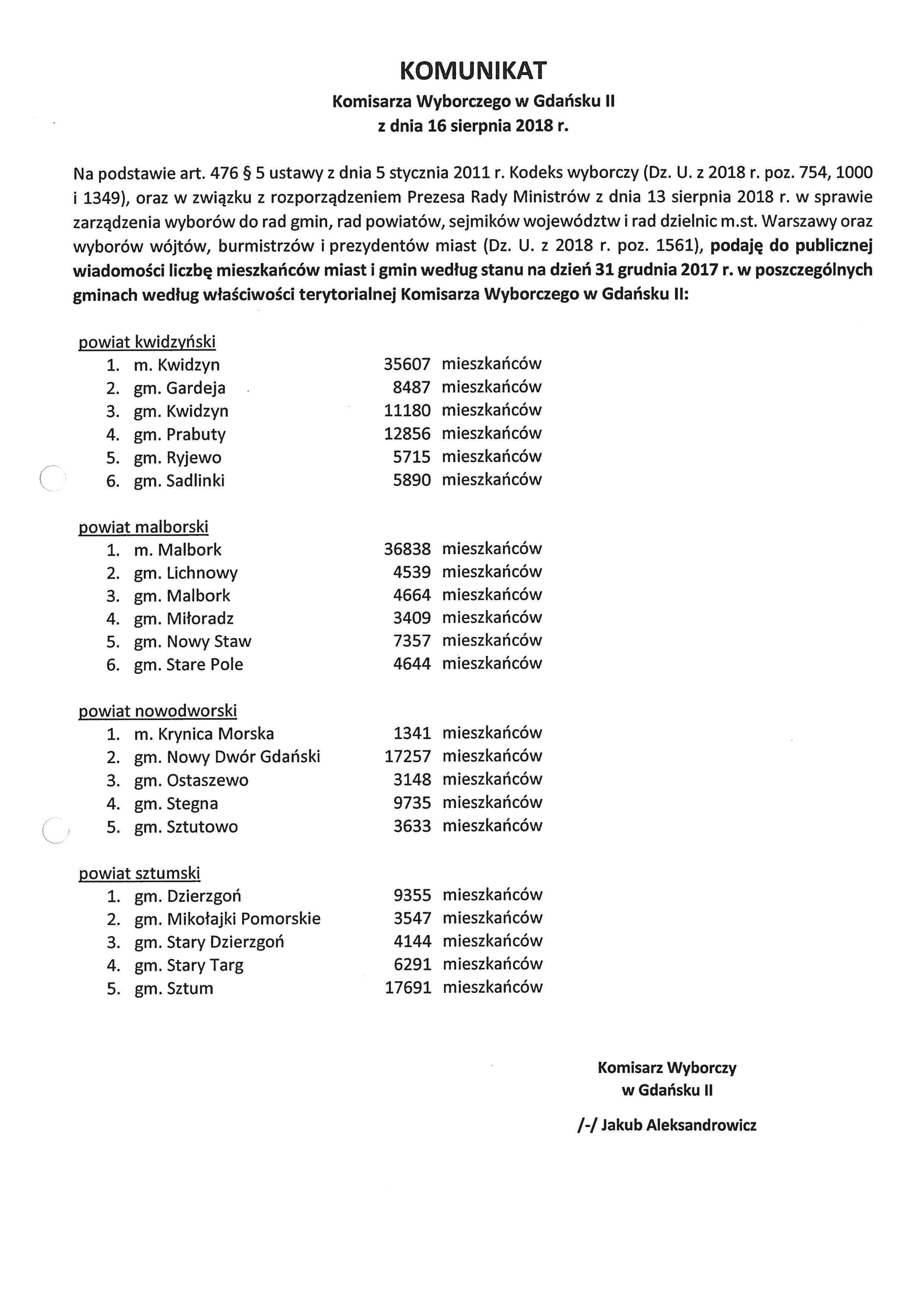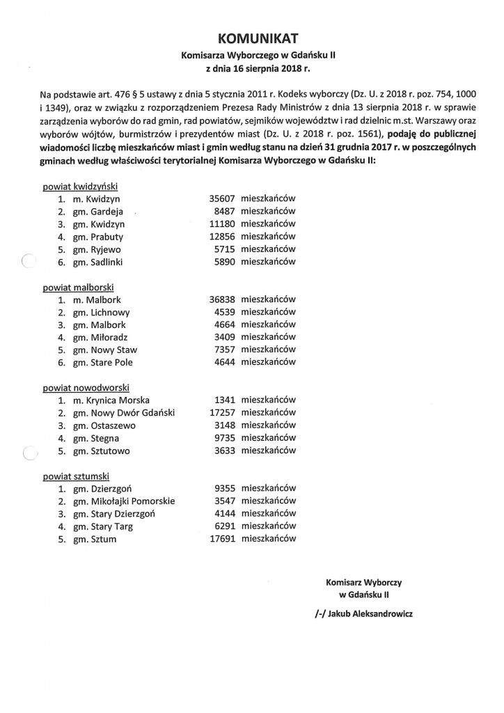 - Podanie do publicznej wiadomości liczby mieszkańców miast i gmin wg staniu na dzień 31.12.2017 r.