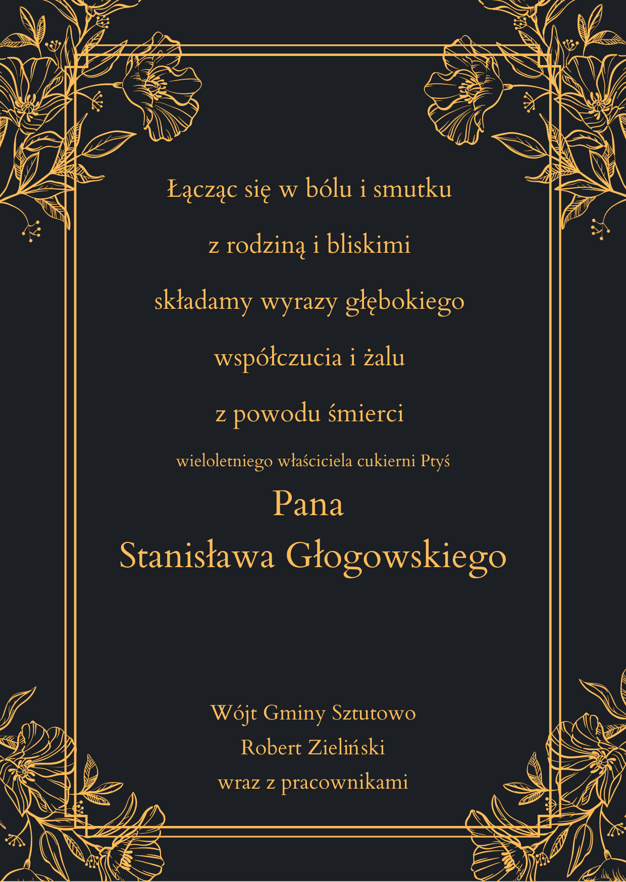 Strona główna » Aktualności » KONDOLENCJE Data dodania 12.03.2022 KONDOLENCJE Łącząc się w bólu i smutku z rodziną i bliskimi składamy wyrazy głębokiego współczucia i żalu z powodu śmierci wieloletniego właściciela cukierni Ptyś, Pana Stanisława Głogowskiego Wójt Gminy Sztutowo Robert Zieliński wraz z pracownikami Drukuj