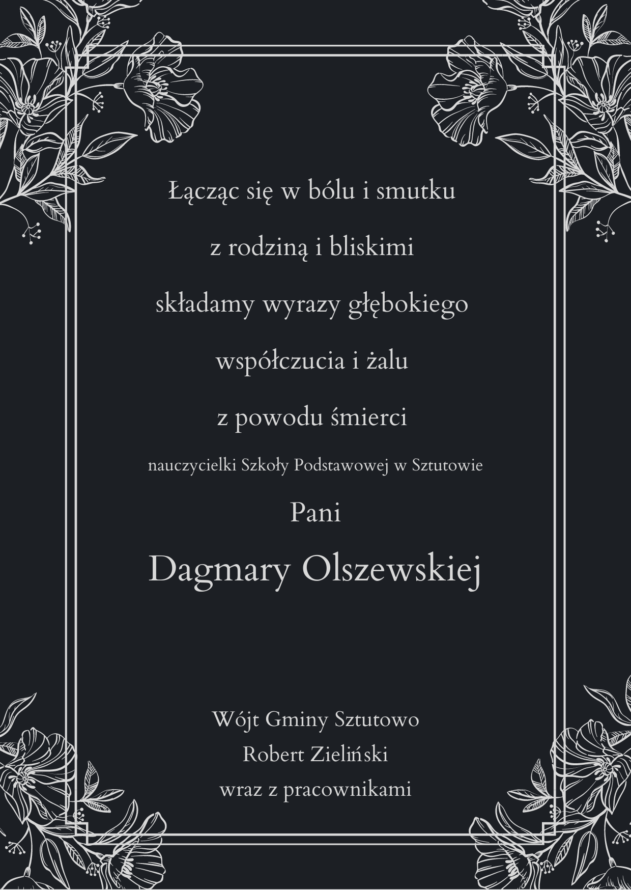 Strona główna » Aktualności » Kondolencje Data dodania 15.03.2022 Kondolencje Łącząc się w bólu i smutku z rodziną i bliskimi składamy wyrazy głębokiego współczucia i żalu z powodu śmierci nauczycielki Szkoły Podstawowej w Sztutowie Pani Dagmary Olszewskiej Wójt Gminy Sztutowo Robert Zieliński wraz z pracownikami Drukuj