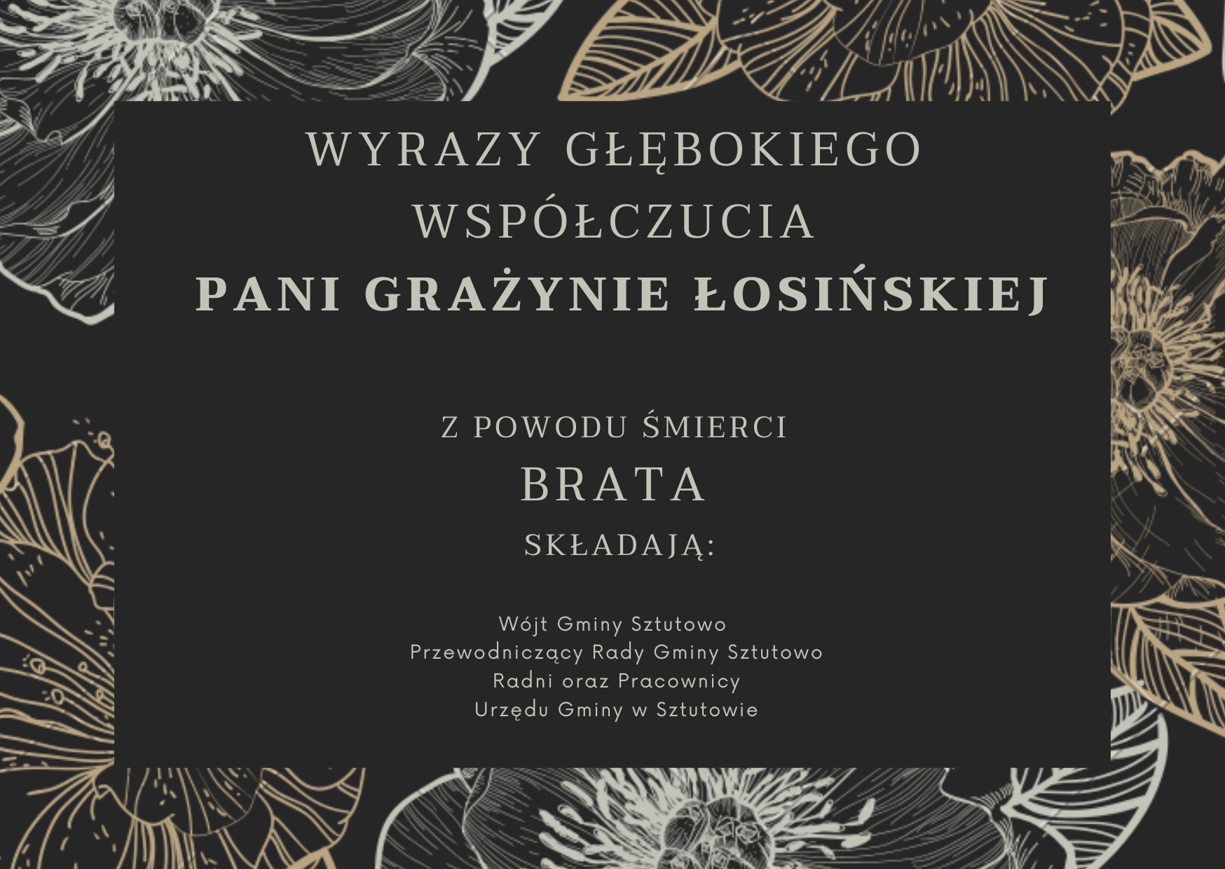 Strona główna » Aktualności » Kondolencje Data dodania 05.01.2026 Kondolencje Wyrazy głębokiego współczucia Pani Grażynie Łosińskiej z powodu śmierci Brata składają: Wójt Gminy Sztutowo Przewodniczący Rady Gminy Sztutowo Radni oraz pracownicy Urzędu Gminy w Sztutowie Drukuj