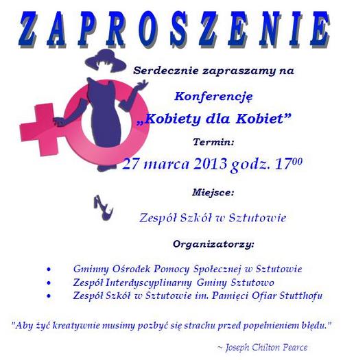 - 1700-1710 Przywitanie uczestniczek konferencji „Kobiety dla kobiet” – imprezę poprowadzi Pani Sylwia Owsińska Dyrektor Zespołu Szkół