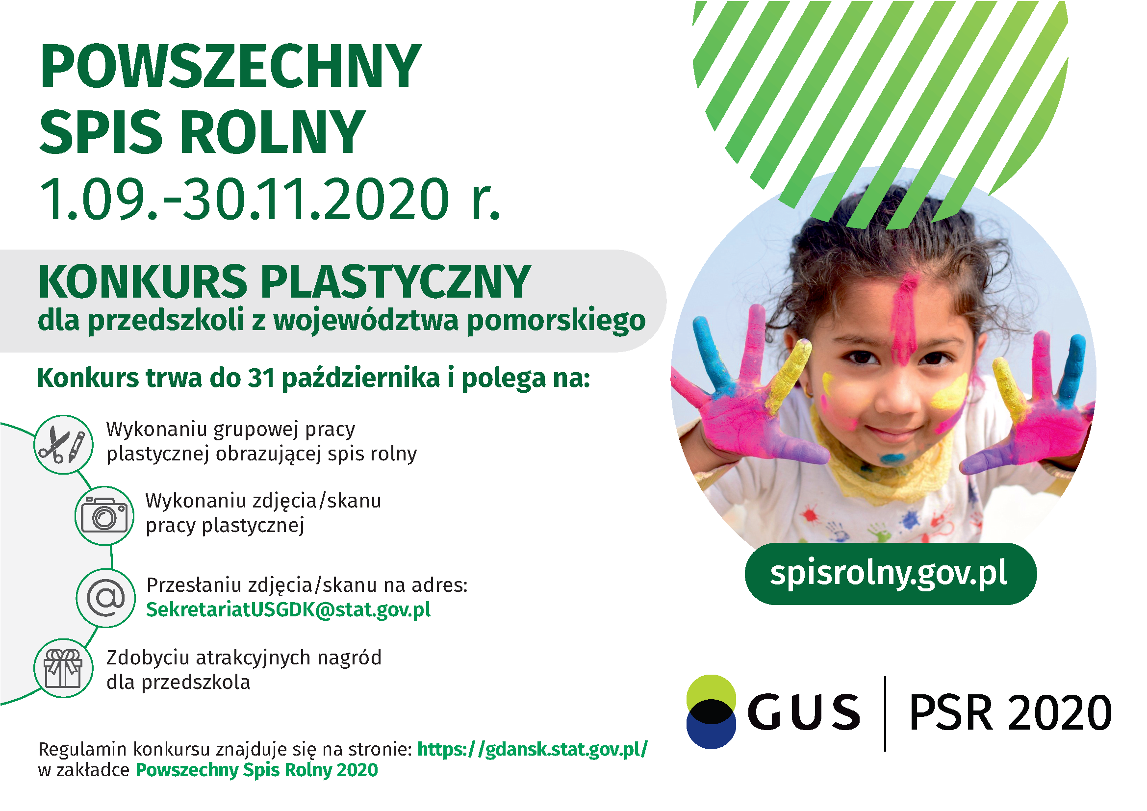Zadaniem konkursowym jest wykonanie pracy plastycznej w dowolnym formacie, w dowolnej technice, na temat Powszechnego Spisu Rolnego 2020. Prace przekazane na konkurs muszą być pracami wykonanymi samodzielnie przez dzieci danej placówki wychowania przedszkolnego pod kierunkiem nauczyciela. Konkurs trwa od 1 października do 31 października 2020 r.
