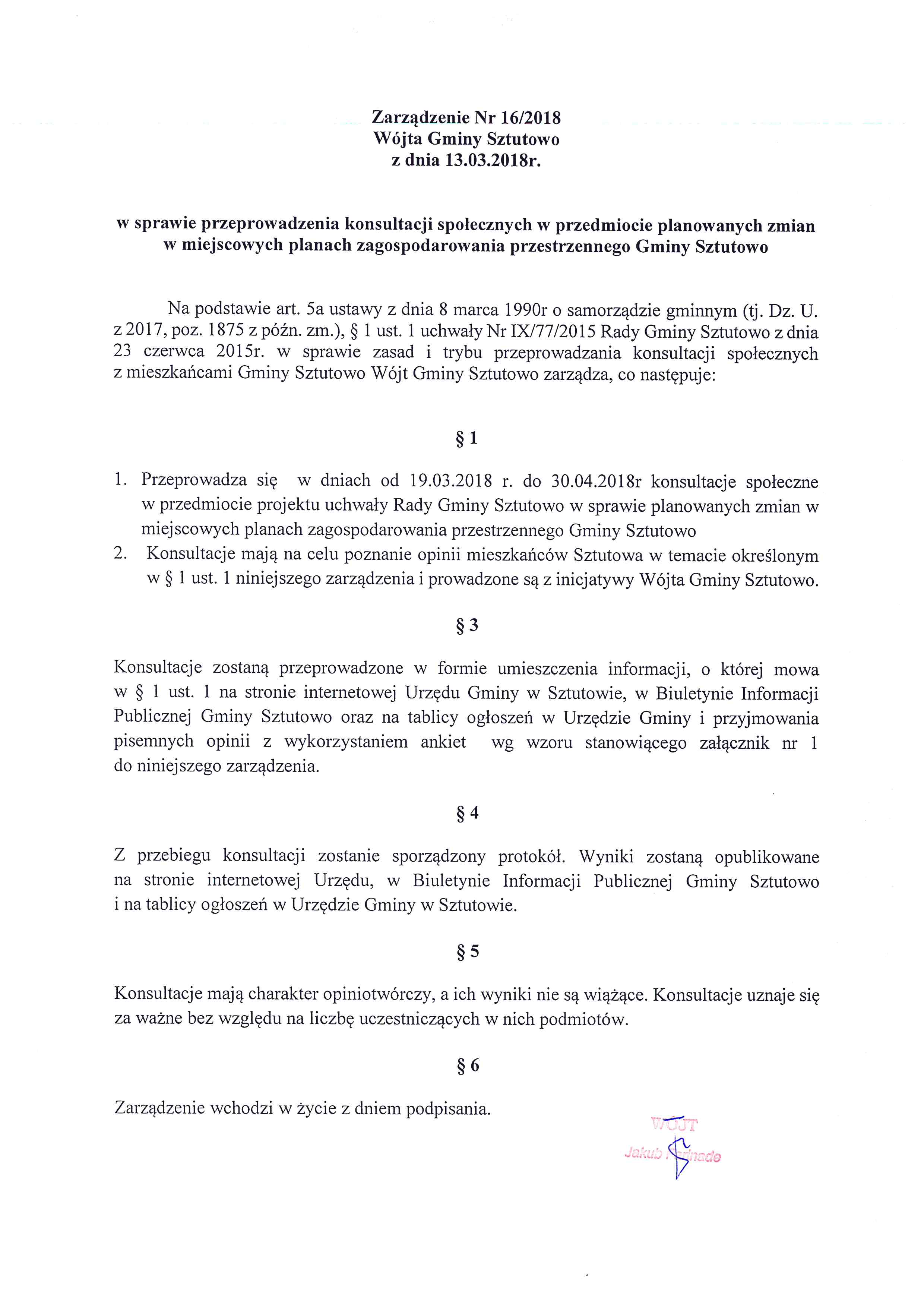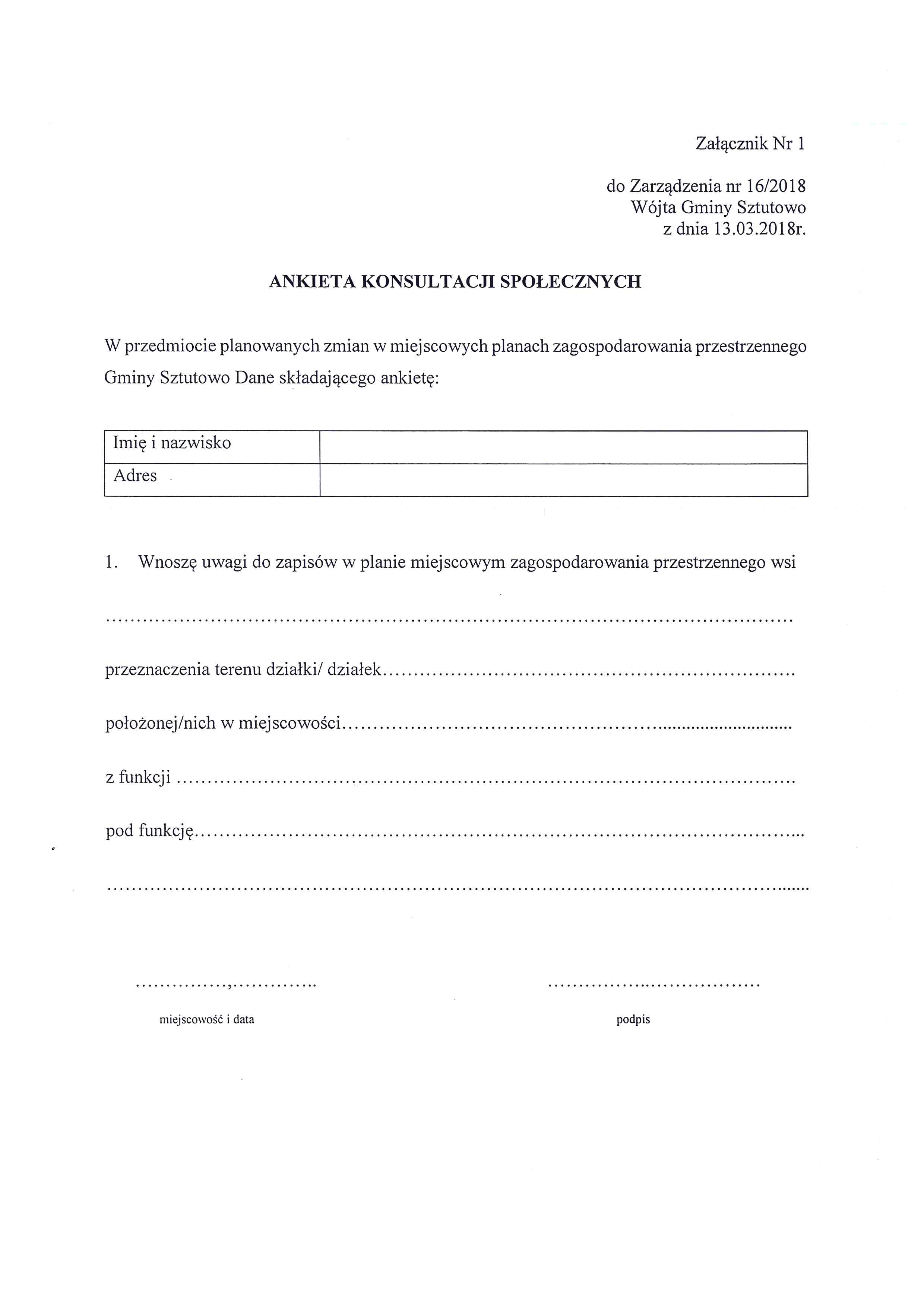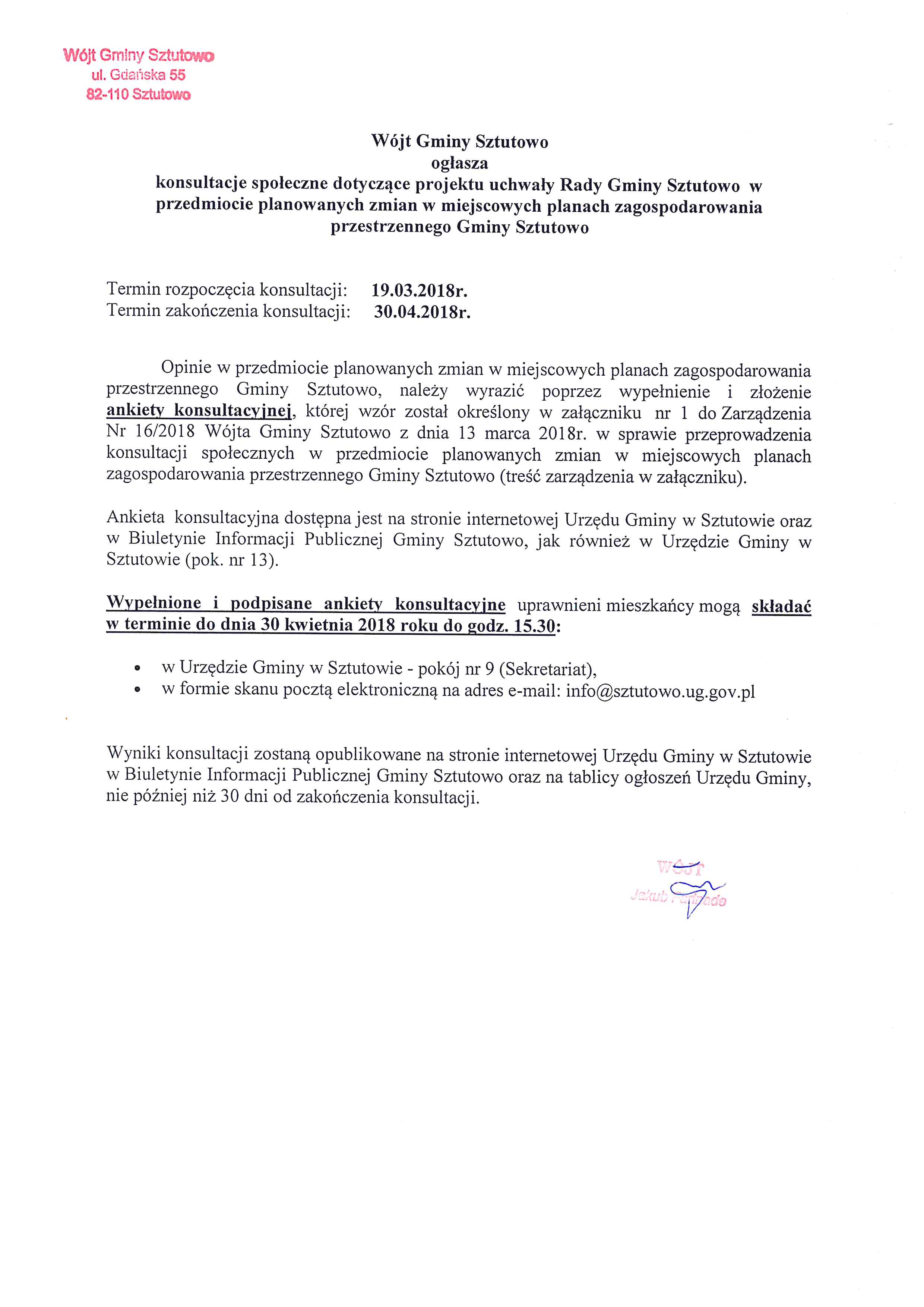 Wójt Gminy Sztutowo ogłasza konsultacje społeczne w przedmiocie planowanych zmian w miejscowych planach zagospodarowania przestrzennego Gminy Sztutowo. Konsultacje przeprowadzone zostaną w dniach 19 marca do 30 kwietnia 2018 r. Swoje opinie należy wyrazić poprzez wypełnienie i złożenie ankiety konsultacyjnej do 30 kwietnia br. do godziny 15:30 w sekretariacie Urzędu Gminy (pokój nr 9) lub w formie skanu pocztą elektroniczna na adres: info@sztutowo.ug.gov.pl. Szczegóły w załącznikach: