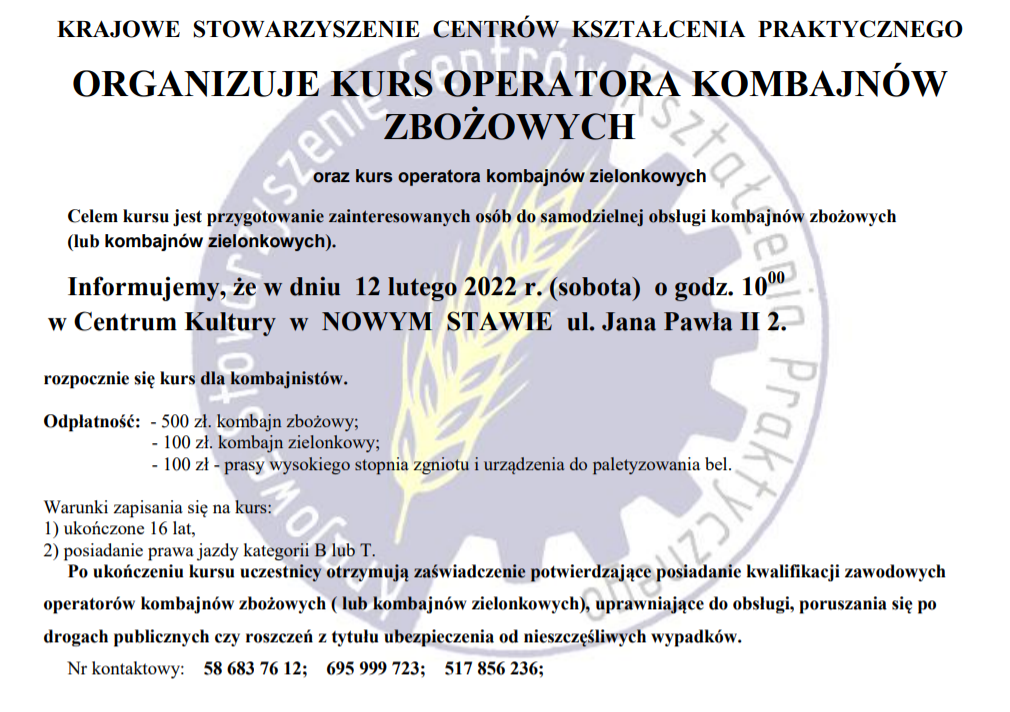 Informujemy, że w dniu 12 lutego 2022 r. (sobota) o godz. 10:00 w Centrum Kultury w NOWYM STAWIE ul. Jana Pawła II 2. rozpocznie się kurs dla kombajnistów.