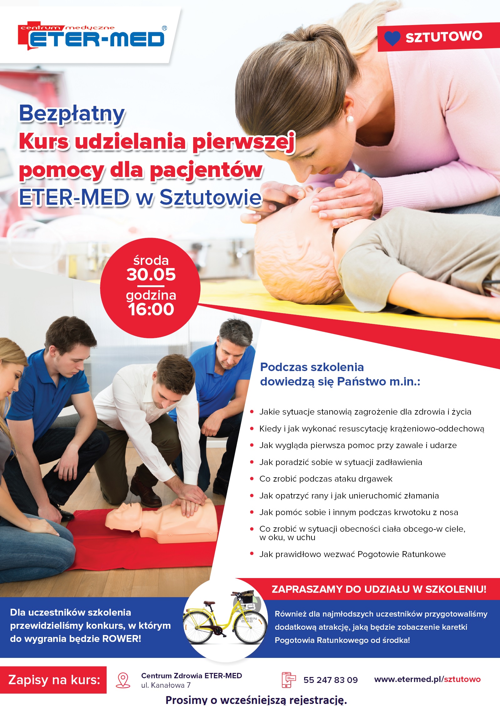 Prosimy o wcześniejszą rezerwację miejsca w szkoleniu osobiście (Sztutowo, Kanałowa 7), telefonicznie (55 247 83 09) lub przez Internet: portal.etermed.pl