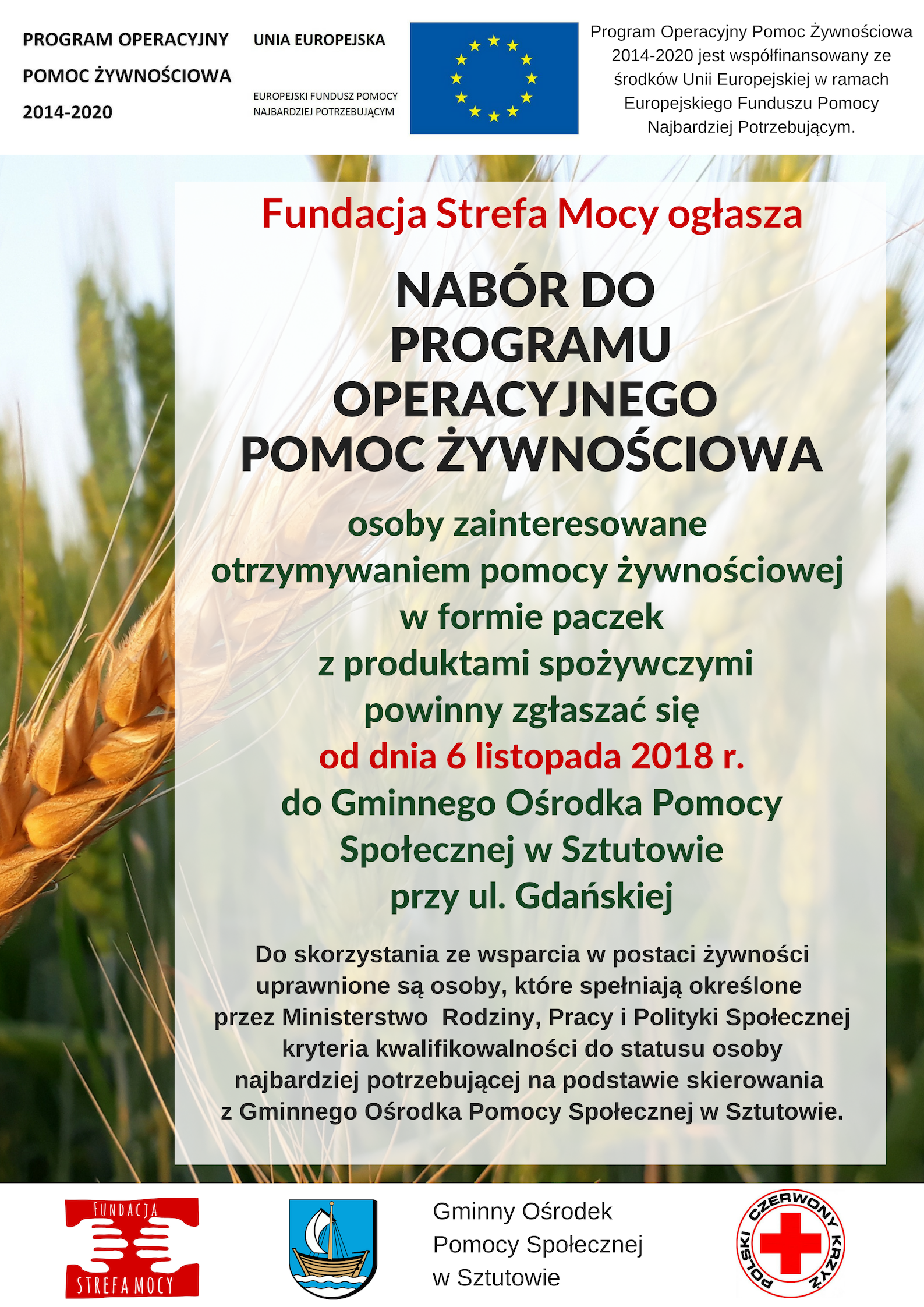 Fundacja Strefa Mocy ogłasza nabór do Programu Operacyjnego Pomoc Żywnościowa na rok 2018. Wszystkie osoby zainteresowane otrzymywaniem pomocy w postaci paczek z produktami spożywczymi powinny zgłaszać się od dnia 6 listopada 2018 r. do Gminnego Ośrodka Pomocy Społecznej w Sztutowie. Uzyskane tam skierowanie będzie podstawą do odbioru żywności, między innymi mleka, cukru, makaronu, ryżu, kaszy, konserw mięsnych i warzywnych, oleju, dżemów itp.