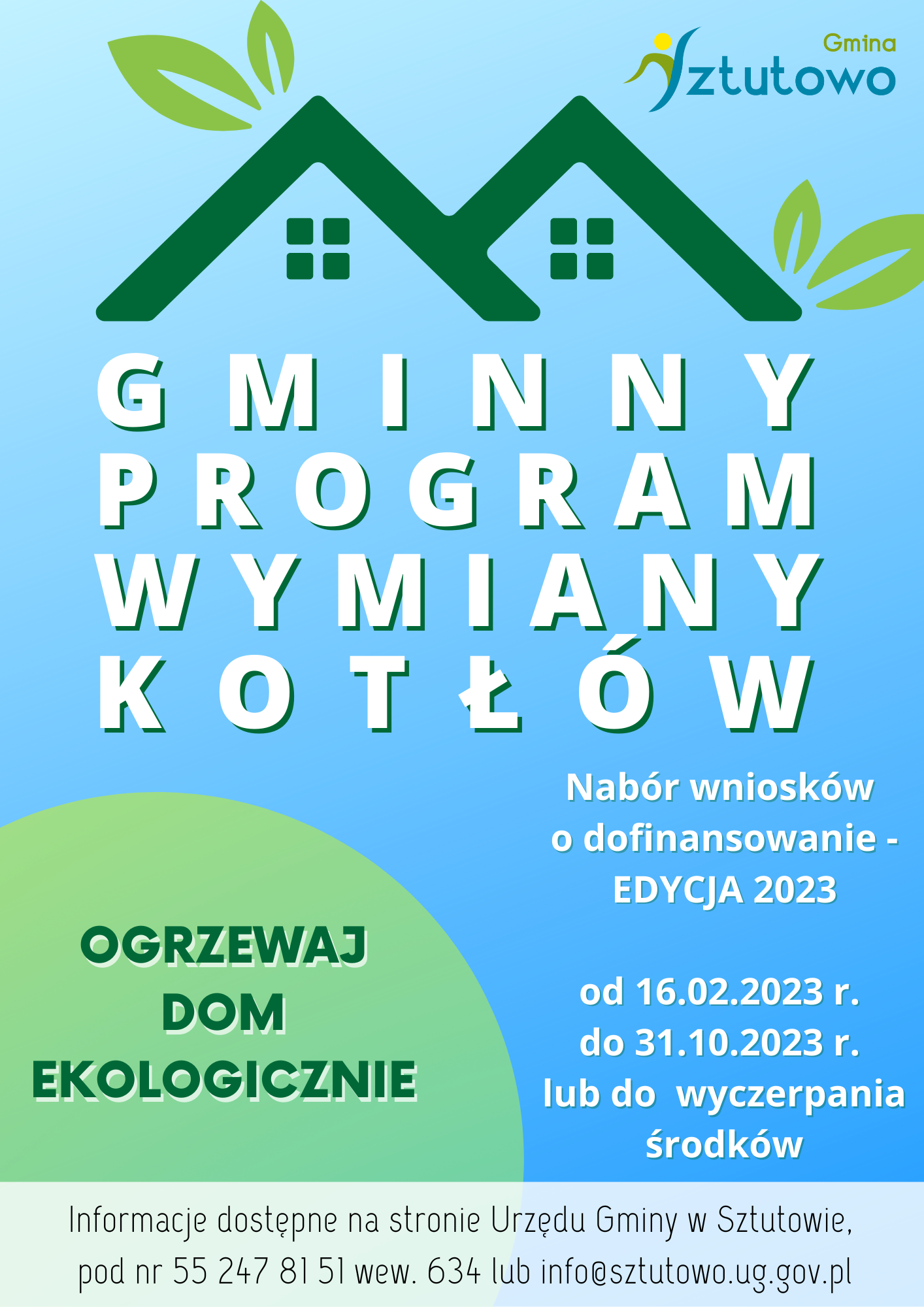 Wójt Gminy Sztutowo zaprasza w terminie od 16.02.2023 r. do 31.10.2023 r. lub do wyczerpania środków, do składania i zastąpienia go ekologicznym systemem grzewczym – edycja 2023.