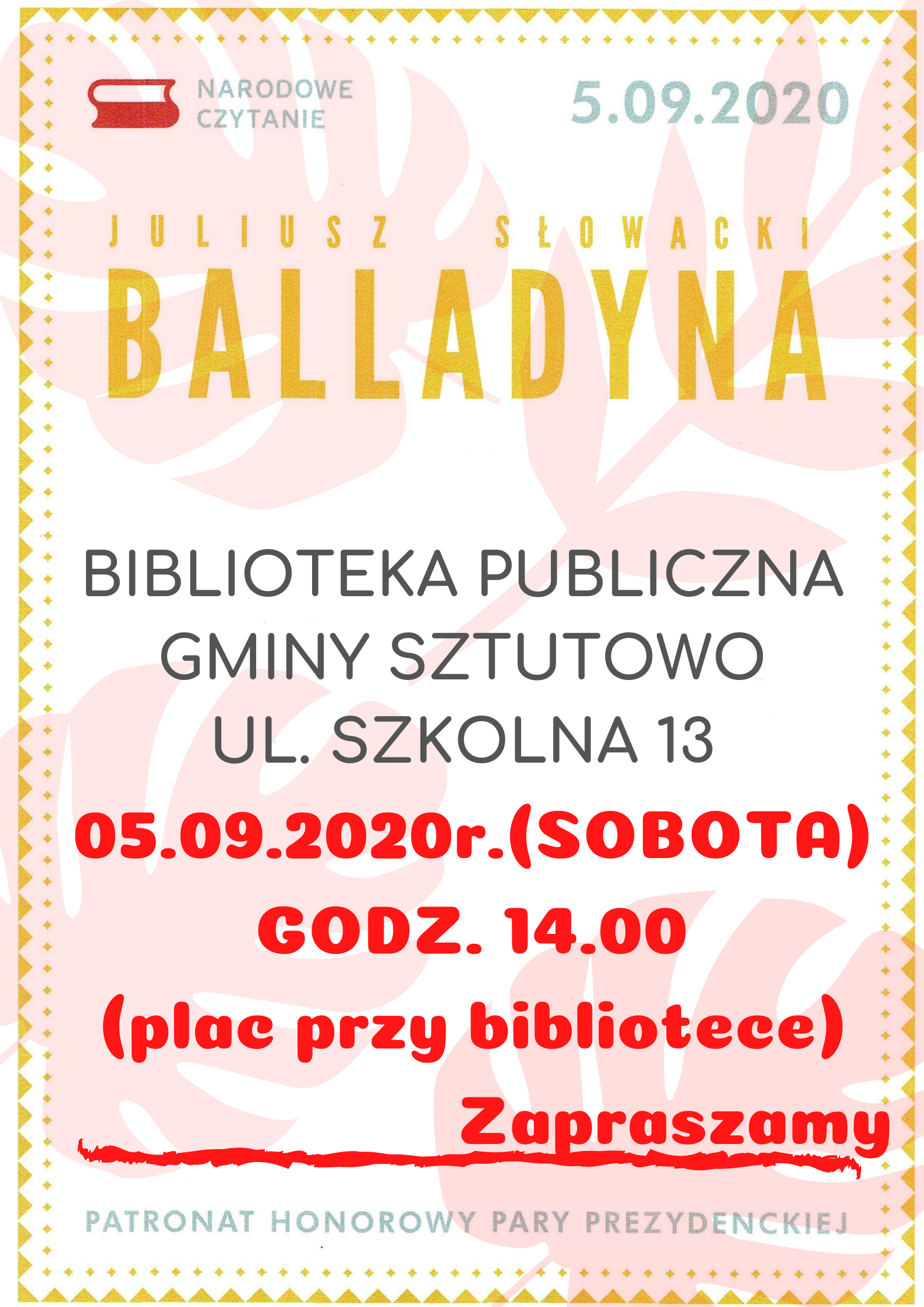 Zachęcamy Państwa od udziału w tegorocznej odsłonie Narodowego Czytania. Spotkajmy się 5.09.2020 (sobota ) o godz. 14.00 przed Biblioteką w Sztutowie i wspólnie przeczytajmy „Balladynę” Juliusza Słowackiego.