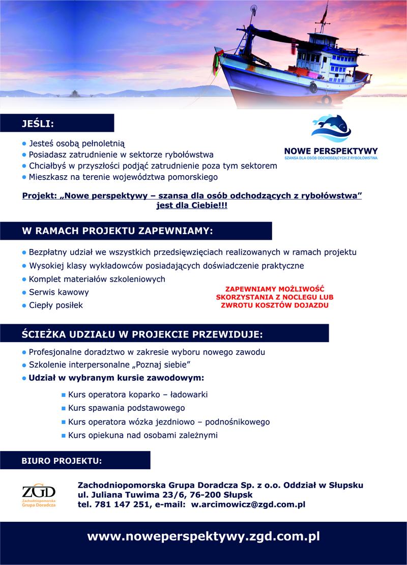 Strona główna » Aktualności » NOWE PERSPEKTYWY – szansa dla osób odchodzących z rybołóstwa Data dodania 27.05.2014 NOWE PERSPEKTYWY – szansa dla osób odchodzących z rybołóstwa Drukuj