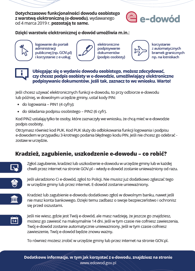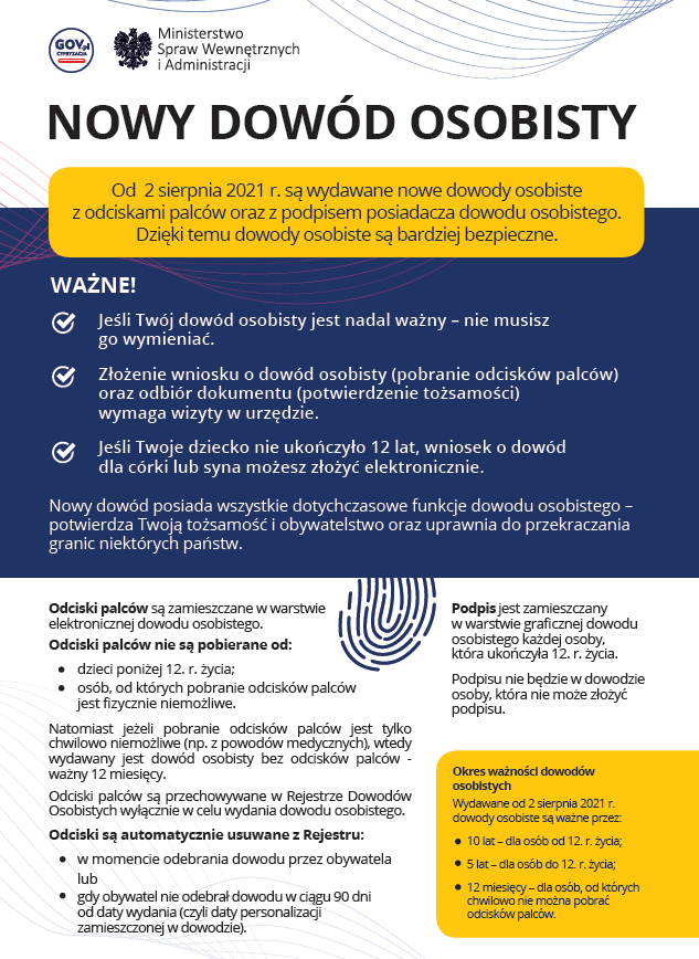 Od 2 sierpnia 2021 r. wydawane są nowe dowody osobiste z odciskami palców oraz z podpisem posiadacza dowodu osobistego. Dzięki temu dowody osobiste są bardziej bezpieczne.