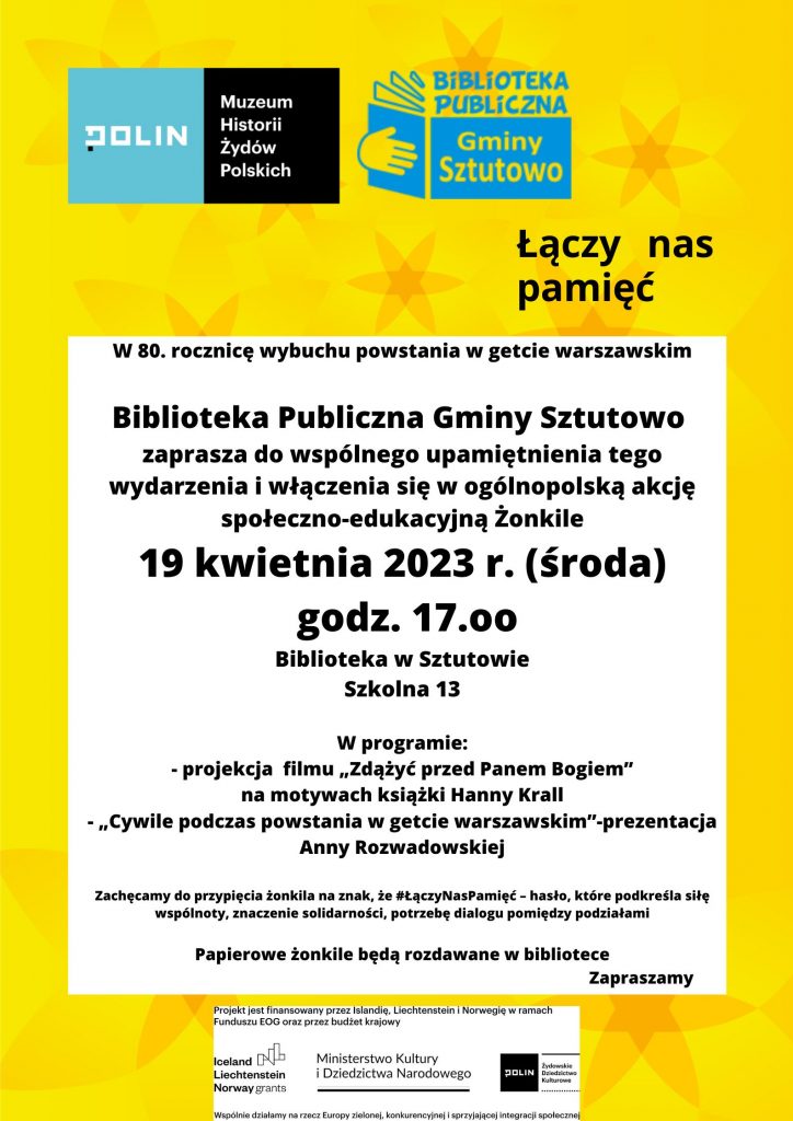 Strona główna » Aktualności » Obchody 80. rocznicy powstania w getcie warszawskim Data dodania 14.04.2023 Obchody 80. rocznicy powstania w getcie warszawskim Biblioteka Publiczna w Sztutowie w dniu 19 kwietnia br. zaprasza do wspólnego upamiętnienia 80-tej rocznicy wybuchu powstania w getcie warszawskim. Przyłączmy się tego dnia do ogólnopolskiej akcji #ŁączyNasPamięć i przypnijmy żonkil na znak pamięci. Drukuj