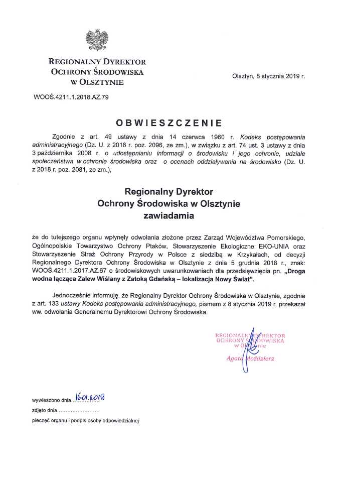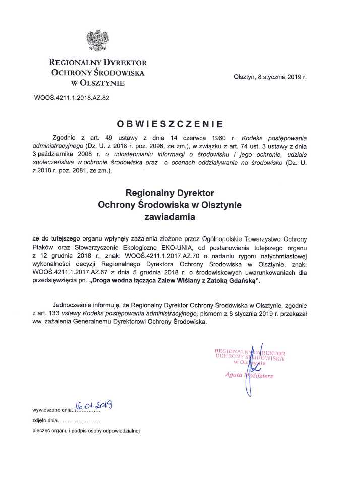 Strona główna » Aktualności » Obwieszczenia Regionalnego Dyrektora Ochrony Środowiska w Olsztynie Data dodania 16.01.2019 Obwieszczenia Regionalnego Dyrektora Ochrony Środowiska w Olsztynie Drukuj