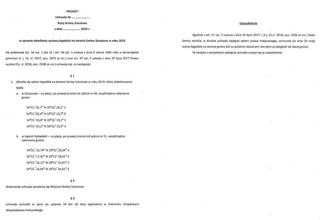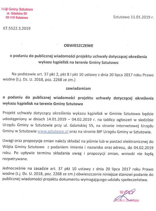 Wójt Gminy Sztutowo zawiadamia o podaniu do publicznej wiadomości projektu uchwały dotyczącej określenia wykazu kąpielisk na terenie Gminy Sztutowo. Uwagi oraz propozycje zmian należy składać na piśmie lub w postaci elektronicznej do Wójta Gminy Sztutowo z podaniem imienia i nazwiska oraz adresu, do 04.02.2019 roku.