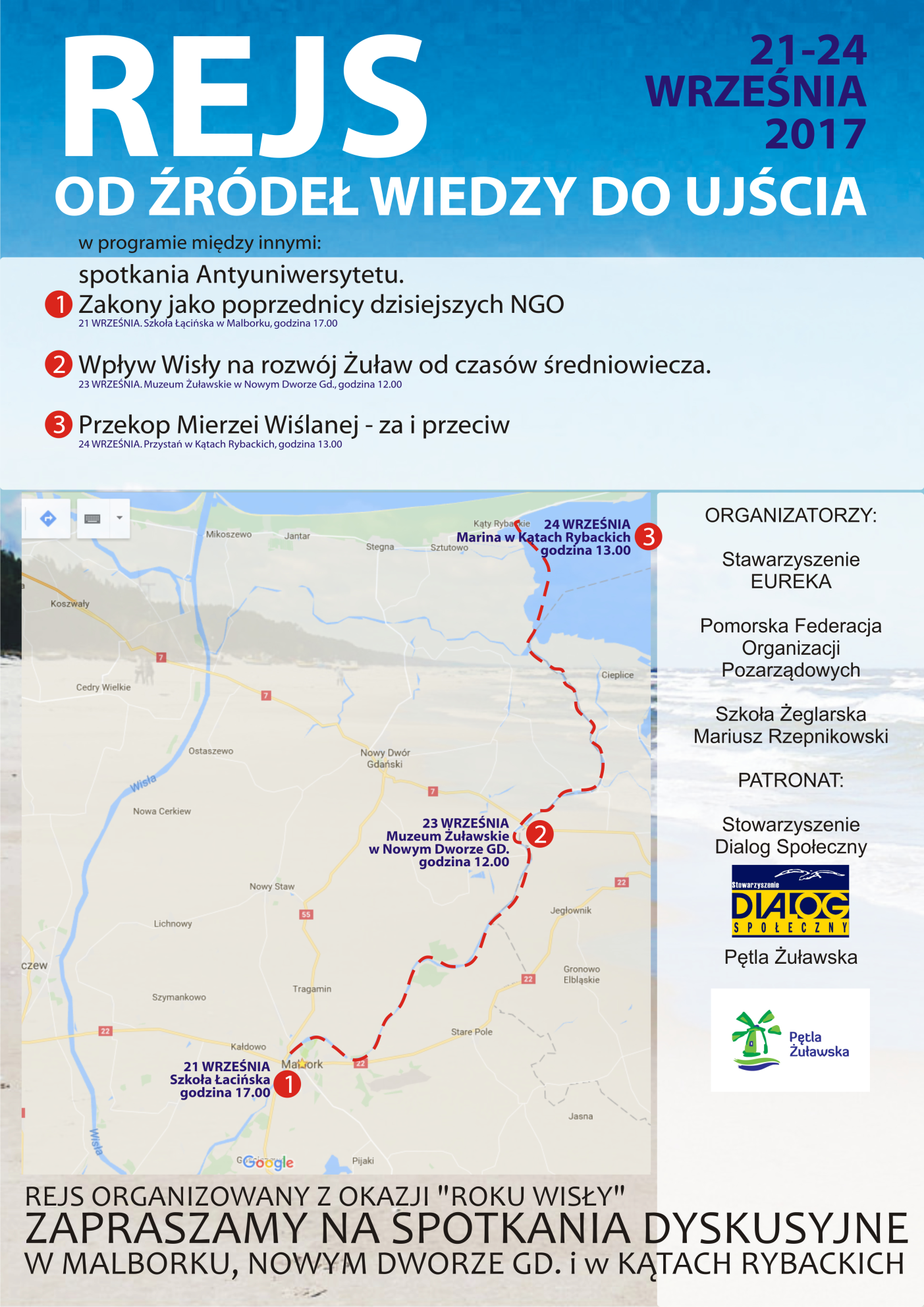 Zapraszamy również chętnych przedstawicieli NGO do udziału w samym rejsie na trasie z Malborka (wypłynięcie o godz 9.00 w dniu 22 września, zakończenie w Kątach Rybackich 24 września). 8 WOLNYCH MIEJSC CZEKA NA CHĘTNYCH, KTÓRZY ZECHCĄ POPŁYNĄĆ Z NAMI I ZGŁOSZĄ SIĘ (mail eureka.org@poczta.fm; tel 667171780) DO GODZ 20.00 W DNIU 15 WRZEŚNIA 2017. DECYDUJE KOLEJNOŚĆ ZGŁOSZEŃ.