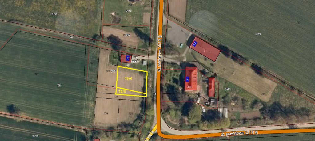 Działki gruntowe niezabudowane nr 72/3, 73/6 położone w Groszkowie. Nieruchomości zlokalizowane w środkowej części obrębu Groszkowo. Dojazd do nieruchomości bezpośrednio z drogi powiatowej nr 2316 G. W sąsiedztwie znajduje się zabudowa zagrodowa, tereny wykorzystywane rolniczo.