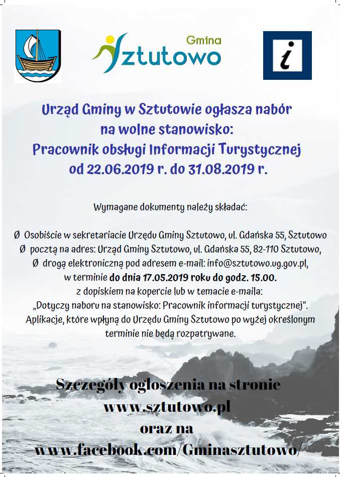 Szczegóły ogłoszenia w rozwinięciu.Urząd Gminy w Sztutowie ogłasza nabór na wolne stanowisko: Pracownik obsługi Informacji Turystycznej od 22.06.2019 r. do 31.08.2019 r.