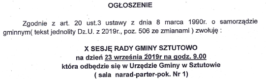 Strona główna » Aktualności » Ogłoszenie o sesji Rady Gminy Sztutowo Data dodania 13.09.2019 Ogłoszenie o sesji Rady Gminy Sztutowo Porządek obrad do pobrania Drukuj