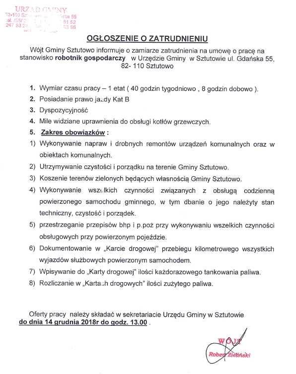 Strona główna » Aktualności » Ogłoszenie o zatrudnieniu Data dodania 30.11.2018 Ogłoszenie o zatrudnieniu Drukuj