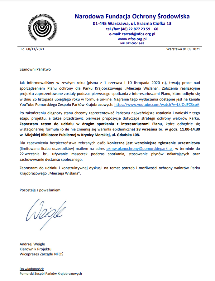 Informujemy, że do Urzędu Gminy w Sztutowie wpłynęło pismo Narodowej Fundacji Ochrony Środowiska, dotyczące prac nad sporządzeniem Planu ochrony dla Parku Krajobrazowego „Mierzeja Wiślana”.