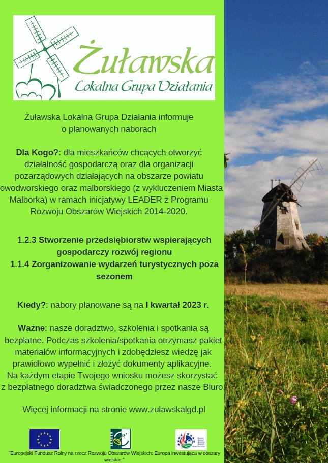 Strona główna » Aktualności » Planowane nabory wniosków w Żuławskiej LGD Data dodania 22.12.2022 Planowane nabory wniosków w Żuławskiej LGD Drukuj