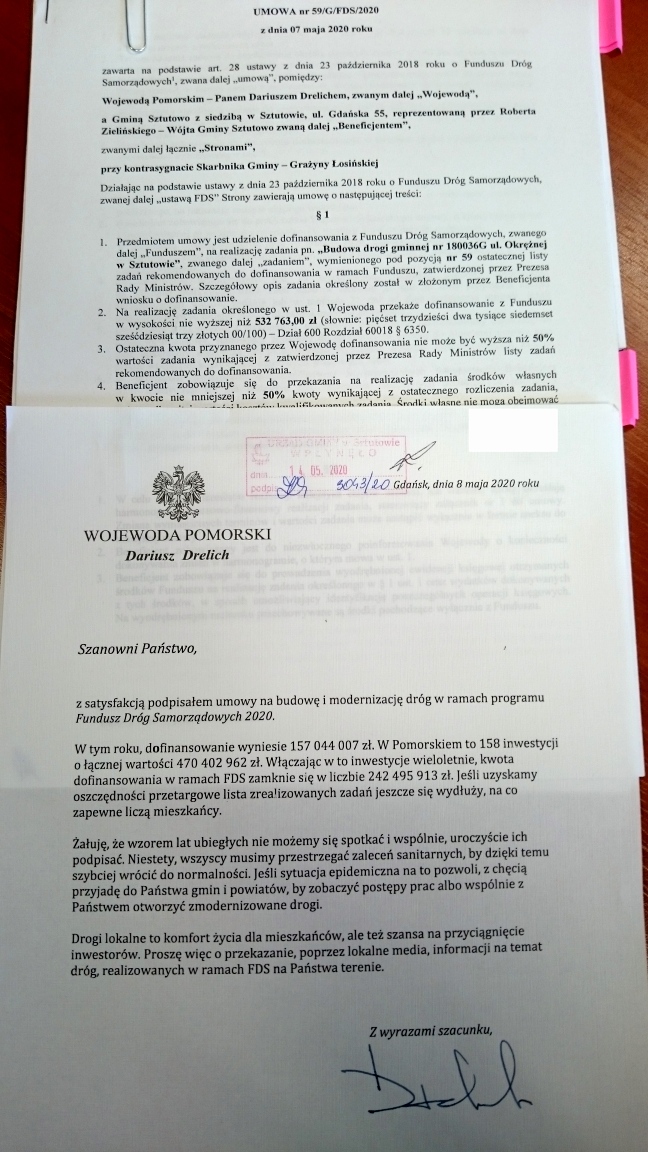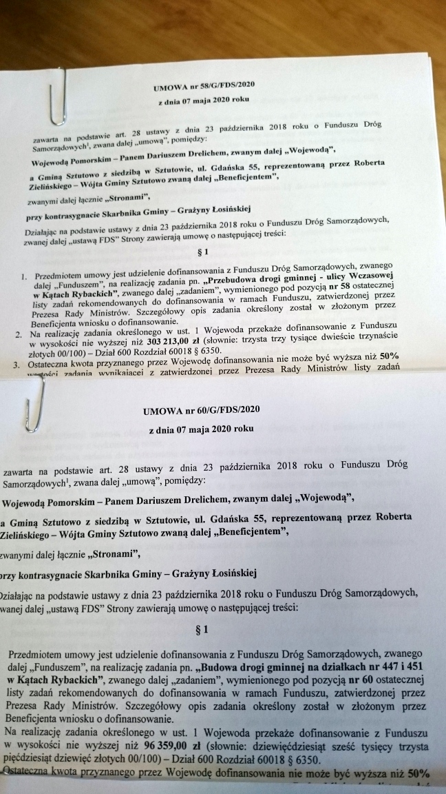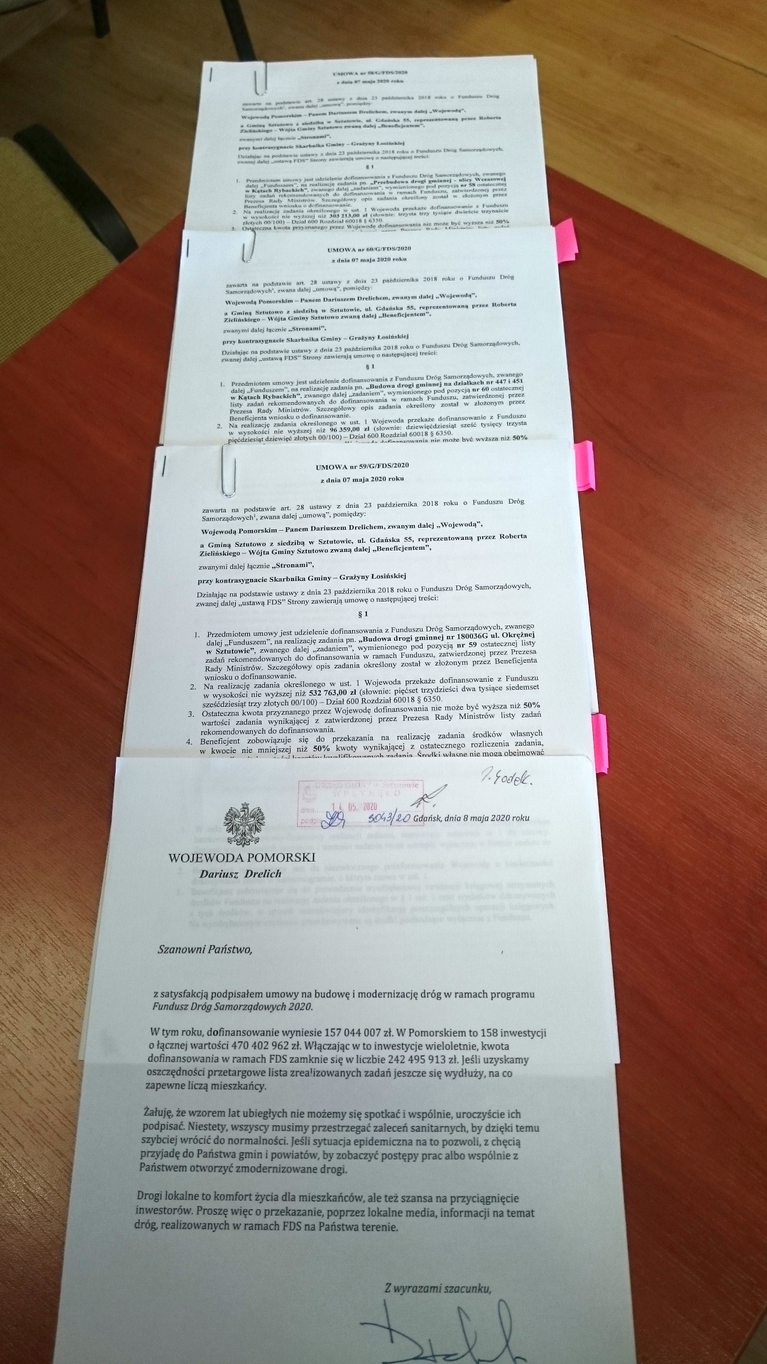 Miło nam poinformować, że 3 umowy na dofinansowanie przebudowy dróg lokalnych w Gminie Sztutowo zostały podpisane przez Wojewodę Pomorskiego oraz Wójta Gminy Sztutowo. W ramach Funduszu Dróg Samorządowych w 2020 r. zostaną zrealizowane prace: