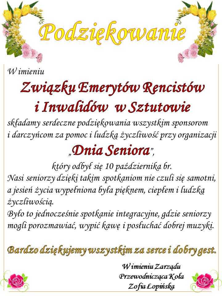 Strona główna » Aktualności » Podziękowania od Związku Emerytów, Rencistów i Inwalidów w Sztutowie Data dodania 17.10.2018 Podziękowania od Związku Emerytów, Rencistów i Inwalidów w Sztutowie Drukuj