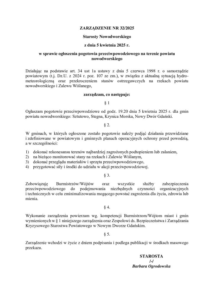W związku z przekroczeniem stanów ostrzegawczych w rzekach powiatu nowodworskiego i wodach Zalewu Wiślanego, Starosta Nowodworski wydał Zarządzenie nr 32/2025 z dnia 5 kwietnia 2025 roku, w którym ogłosił pogotowie przeciwpowodziowe dla gmin: Nowy Dwór Gdański, Stegna, Sztutowo i Krynica Morska.