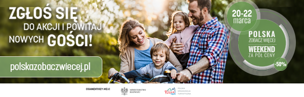 Ruszył nabór do 8. edycji akcji „POLSKA ZOBACZ WIĘCEJ – WEEKEND ZA PÓŁ CENY”. Zapraszamy przedsiębiorców z branży turystycznej, instytucje samorządowe, hotelarzy, restauratorów, organizacje i instytucje związane z obsługą ruchu turystycznego, a także organizatorów eventów sportowych – rejestracja trwa do 31 stycznia. Wiosenna edycja odbędzie się w weekend 20-22 marca. Udział w akcji to nie tylko szansa na pozyskanie nowych klientów z Polski i za granicy, ale także doskonała okazja do darmowej reklamy.