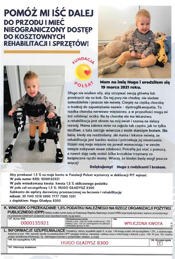 Strona główna » Aktualności » Potrzebna pomoc dla mieszkańca Gminy Sztutowo Data dodania 11.01.2023 Potrzebna pomoc dla mieszkańca Gminy Sztutowo Szanowni Państwo, Nasz mały mieszkaniec potrzebuje wsparcia . Jeśli macie Państwo możliwość wesprzeć Huga przekazując swoje 1,5% w deklaracji rocznej PIT, bardzo gorąco do tego zachęcamy Drukuj