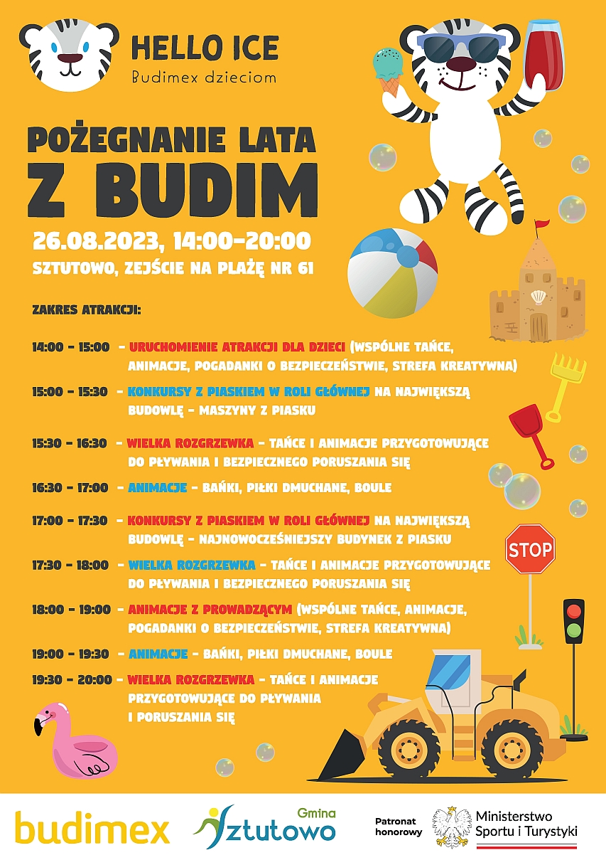Strona główna » Bez kategorii » Pożegnanie lata z Budim Data dodania 22.08.2023 Pożegnanie lata z Budim Już w najbliższą sobotę 26 sierpnia zapraszamy na plażę w Sztutowie, by wspólnie pożegnać wakacje. Na dzieci czeka moc atrakcji. Bądźcie z nami! Organizator: Budimex SA, Gmina Sztutowo. Drukuj