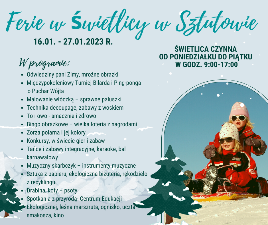 Strona główna » Aktualności » Program na ferie zimowe w Świetlicy w Sztutowie Data dodania 10.01.2023 Program na ferie zimowe w Świetlicy w Sztutowie Drukuj