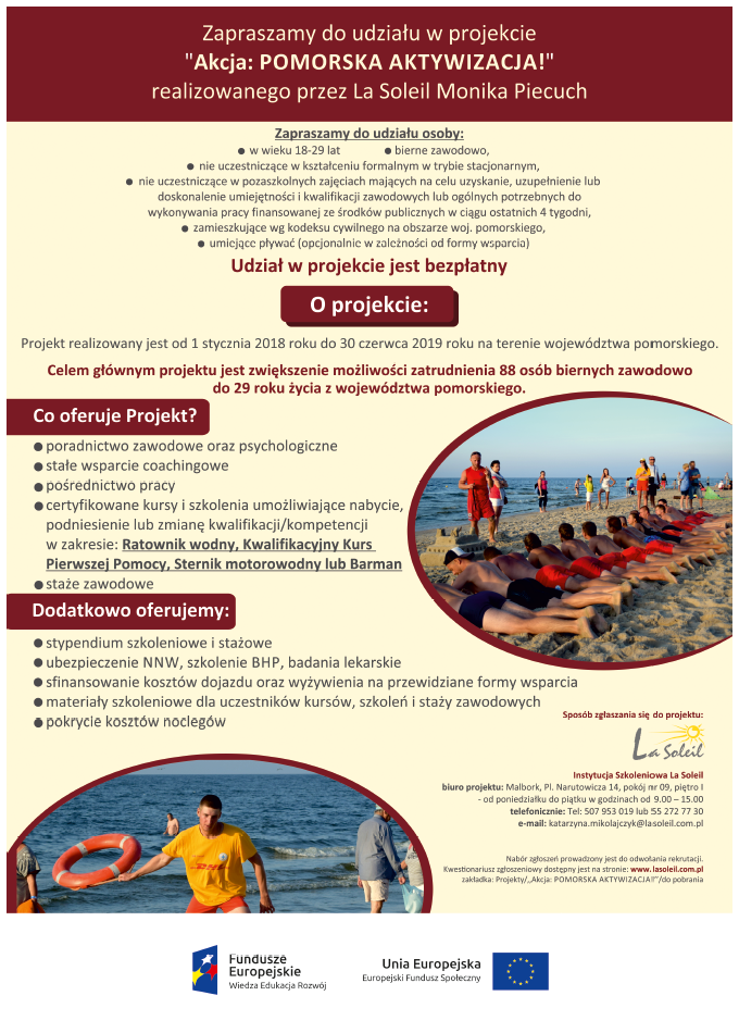 Instytucja szkoleniowa LA SOLEIL zachęca do wzięcia udziału w projekcie pt. ,,Akcja: POMORSKA AKTYWIZACJA!’’. Projekt ukierunkowany jest dla osób biernych zawodowo w wieku poniżej 29 roku życia, znajdujących się w trudnej sytuacji na rynku pracy, zamieszkujących na terenie województwa pomorskiego. Głównym celem projektu jest zwiększenie szans na zatrudnienie osób znajdujących w powyżej wskazanej grupie.