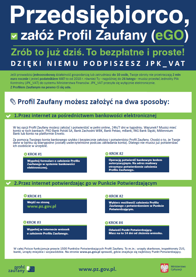 Od 1 stycznia najmniejsi przedsiębiorcy – płatnicy VAT, zatrudniający do 10 osób, o obrotach nieprzekraczających 2 mln euro rocznie (także prowadzący jednoosobowe działalności gospodarcze) – najpóźniej do 26 lutego 2018 r. po raz pierwszy muszą wysłać do systemu Ministerstwa Finansów Jednolity Plik Kontrolny (JPK_VAT). JPK_VAT przesyła się wyłącznie elektronicznie. Do wypełnienia tego obowiązku potrzebne jest m.in. założenie Profilu Zaufanego.Najbliższy punkt potwierdzający znajduje się w Urzędzie Gminy w Stegnie.