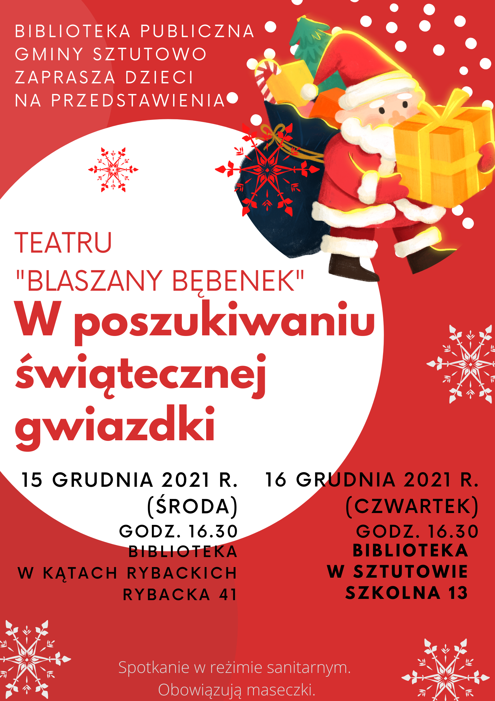 Biblioteka Publiczna Gminy Sztutowo zaprasza dzieci na przedstawienia Teatru Blaszany Bębenek pt. „W poszukiwaniu świątecznej gwiazdki”.