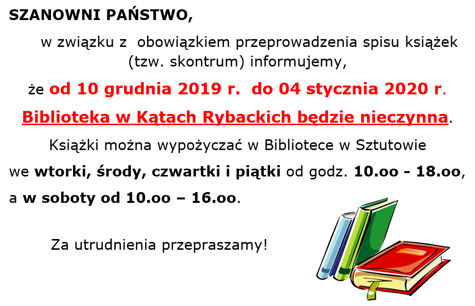 Strona główna » Aktualności » Przerwa w Bibliotece w Kątach Rybackich Data dodania 04.12.2019 Przerwa w Bibliotece w Kątach Rybackich Drukuj