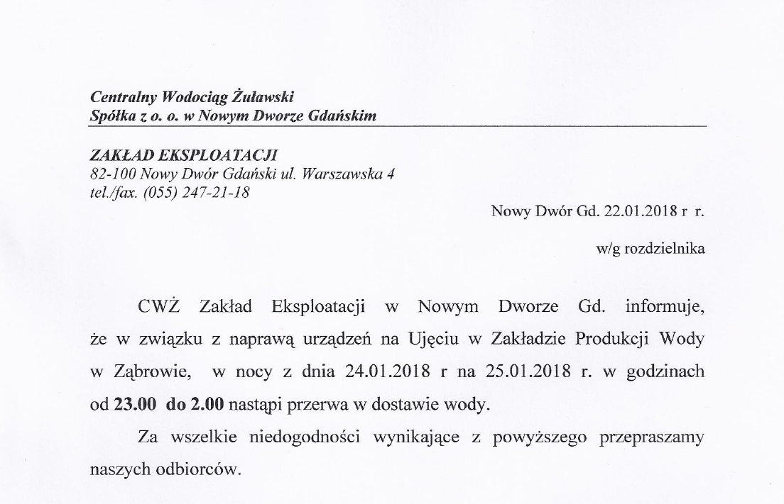 Strona główna » Aktualności » Przerwa w dostawie wody Data dodania 22.01.2018 Przerwa w dostawie wody Drukuj