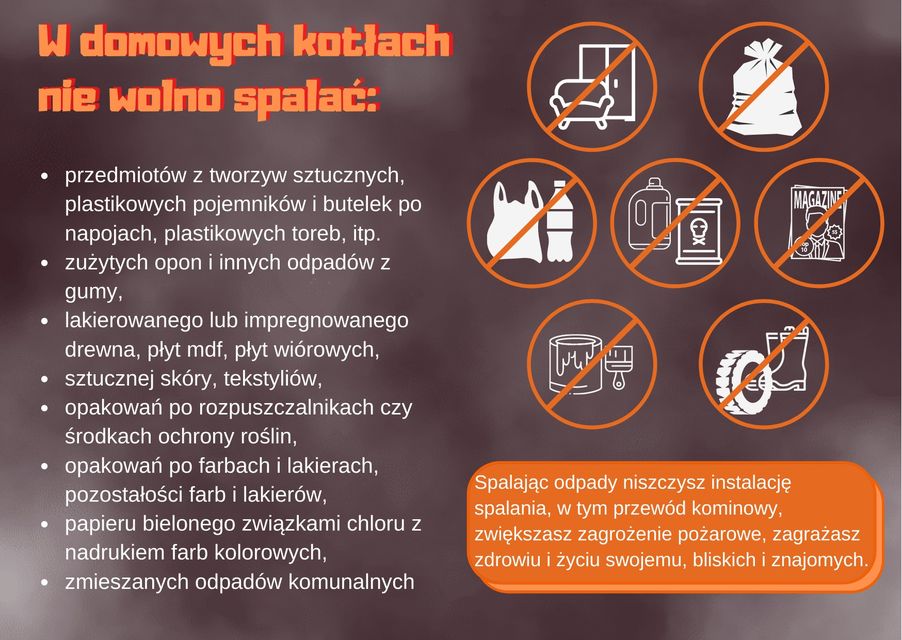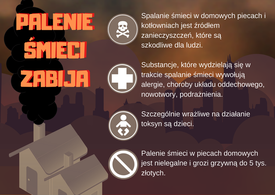 W związku z trwaniem sezonu grzewczego ponownie przypominamy, że obowiązuje ustawowy zakaz spalania odpadów w urządzeniach nieprzystosowanych do tego celu, ale co najważniejsze to my sami musimy mieć świadomość, na co narażamy siebie i sąsiadów, paląc śmieci w domowym piecu.
